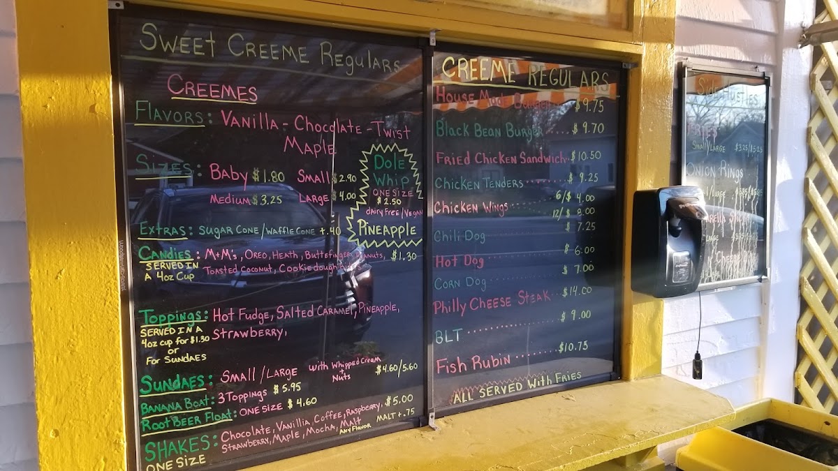 At Village Creeme Stand, the menu offers a delightful range of classic comfort food and signature sweet treats that reflect the charm of the local area. The Fries are a must-try, perfectly crispy and golden, ideal for snacking or as a side to the other main offerings. For dessert, the stand is renowned for its indulgent Maple Creeme, a silky, maple-flavored soft serve that embodies the essence of Vermont's famous syrup. A variation of this treat, the Maple Cone, offers the same rich flavor in a crunchy cone, making for a perfect on-the-go dessert. For those seeking a bit more variety, the Chocolate Vanilla Swirl Creemee is a fantastic choice, combining the best of both worlds with a smooth swirl of chocolate and vanilla flavors. Whether you’re craving savory fries or a refreshing sweet treat, the menu at Village Creeme Stand serves up satisfying options that will leave you coming back for more.
